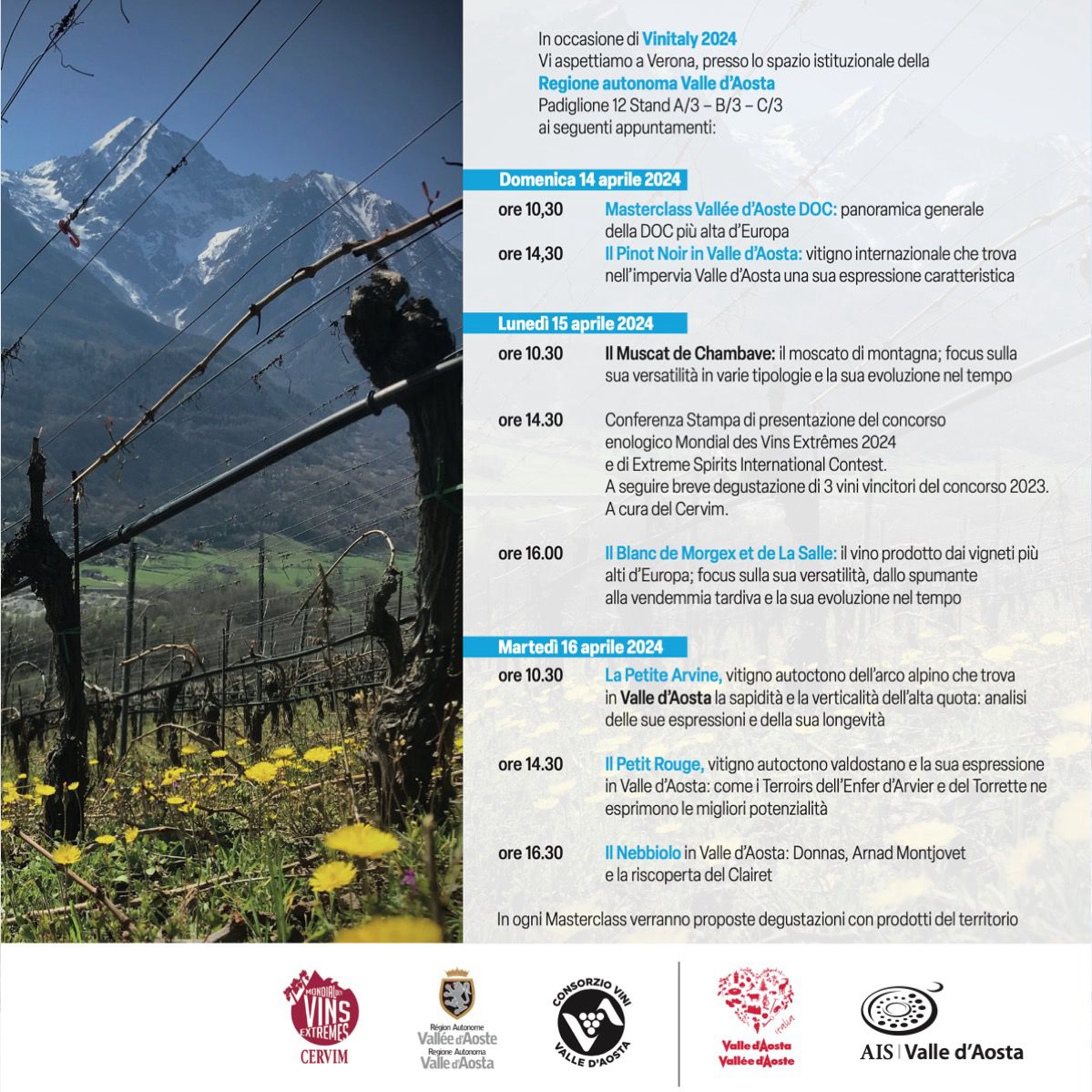 In occasione del Vinitaly 2024, AIS Valle d’Aosta seguirà le seguenti Masterclass sui vini valdostani: